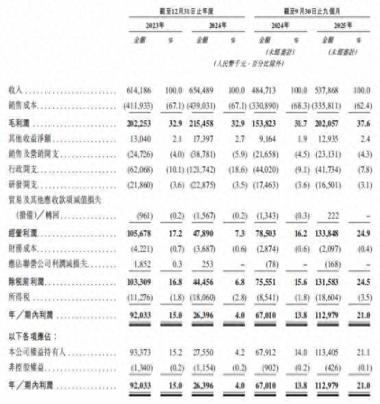 智通财经APP了解到,近三年公司财务发扬呈现“营收稳步增长、利润改造显着”的特征。2023年、2024年及2025年前九个月,收入分手约为6.14亿元、6.54亿元和5.38亿元(单元为东谈主民币,下同),同期净利润则分手为9203.3万元、2639.6万元和1.13亿元。