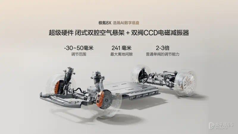 底盘方面,极氪8X配备了主动式踏实杆、闭式双腔空气悬架与双阀 CCD 电磁减振器,并通过智能核心结伙调度,让车辆在高速、弯谈与荡漾路面上,主动诊疗至最好姿态。
